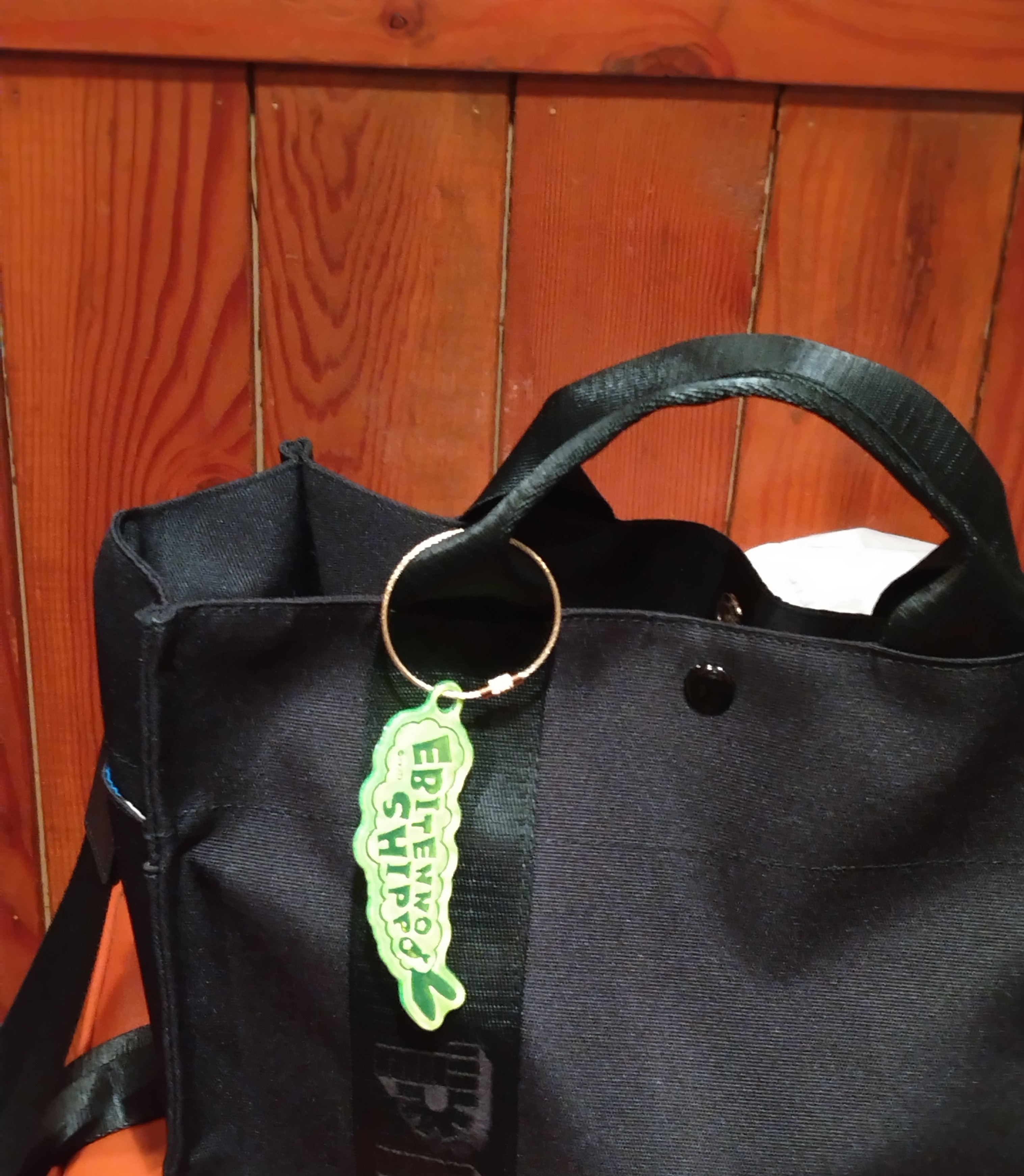 こないだ買ったカバンが真っ黒だったので海老天のしっぽキーホルダーが映える🍤